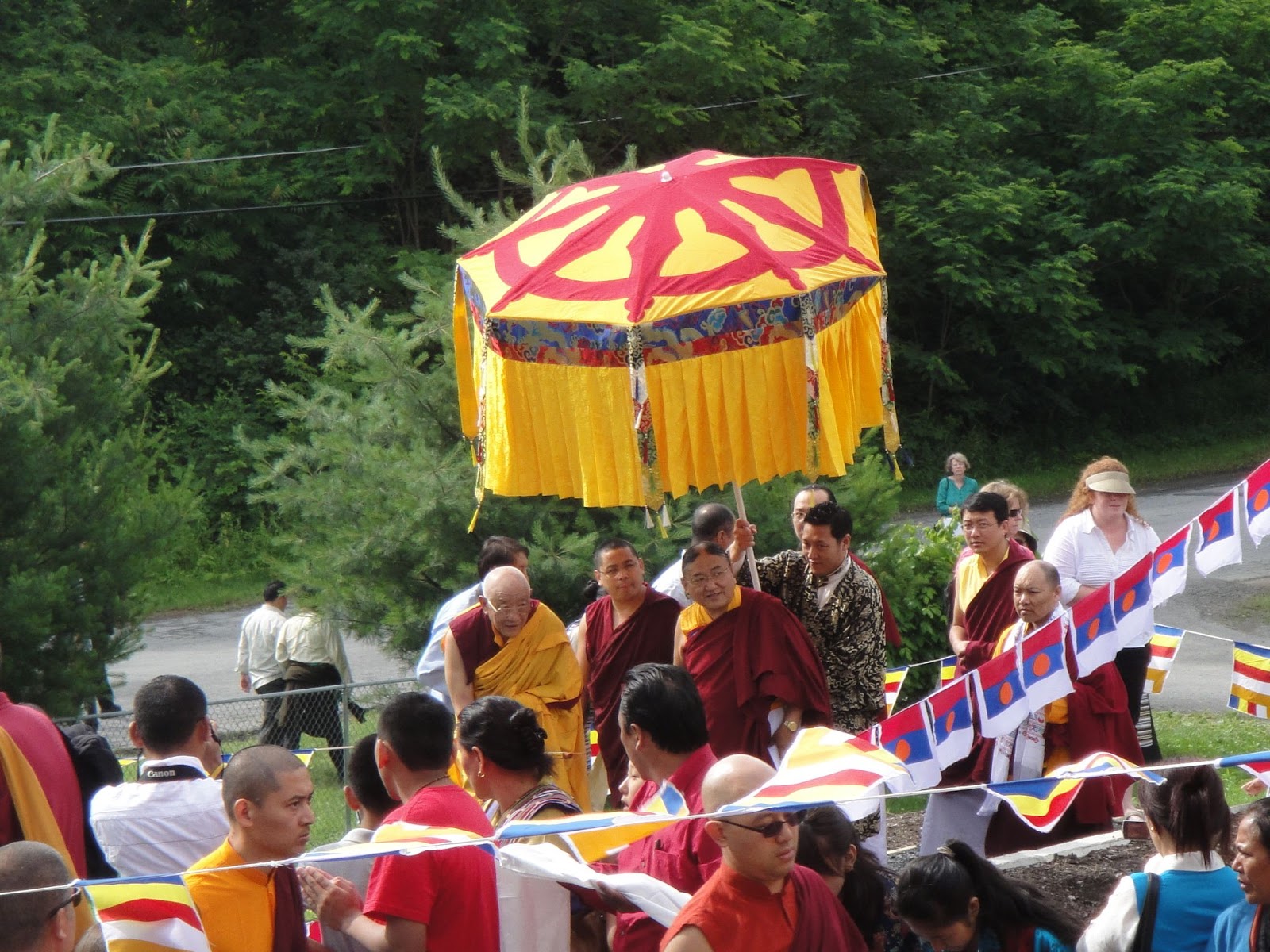 On Saturday, 18 June a "Tenshug" long life ceremony was held for His Holiness Sakya Trizin at Tsechen Kunchab Ling in Walden, New York. Around 1,000 people attended the ceremony. Sponsored statues of the Lamdre lineage masters were offered to His Holiness. Dechen Sakya Centres sponsored two of the statues: one of His Holiness's grandfather, Dakshul Thinley Rinchen, and the other of Sachen Kunga Lodro, a dharma master famed for restoring Sakya during the 18th century.