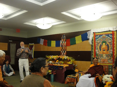 His Holiness then spent the weekend in Manhattan where he was hosted by Khenpo Lama Pema Wangdak, director of the Vikramasila Foundation. On the Friday evening His Holiness was the keynote speaker at a conference on Tibetan Medicine. On the Saturday and Sunday he bestowed the two day Initiation of White Tara. The visit concluded on Monday, 4 July with a celebration for His Holiness' Golden Jubilee and also for the birthday of His son, H. E. Gyana Vajra Rinpoche.