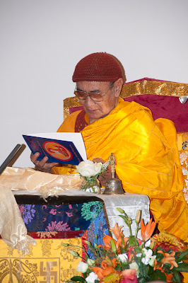 On the Saturday, Lama Jampa asked Rinpoche to bless members of the sangha who happened to be visiting London at that time. Rinpoche kindly agreed to Lama Jampa's request and also bestowed the reading transmission (lung) for his commentary on Nagarjuna's Friendly Letter. Before Rinpoche began the reading transmission, Lama Jampa offered Rinpoche a Mandal Tensum for Rinpoche's long life.