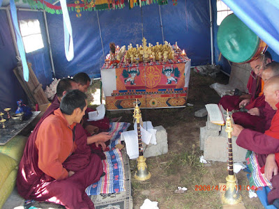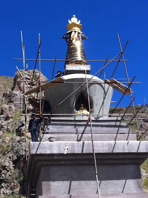 Karma Thinley Rinpoche’s uncle, Namkai Dorje, who lived for many years at Tegchen Legshey Ling in Nepalbefore he passed away several years ago, was the head of the ancient noble clan called Bongsar. Two years ago Namkai Dorje’s daughter Tsodi visited Nangchen and instigated a plan to construct a large stupa at the site of the Bongsar palace, which was located in the vast high grasslands called Drongsho, much of which used to belong to the Bongsar estates until 1959. This year the plans came to fruition, with a large group of Bongsar clan members pooling resources and organising the construction of the magnificent stupa, which was completed at the end of August. Two senior members of the clan stayed at the site and supervised the project, and a group of monks from the famous Bamram Kagyu monastery called Chodrak Gompa, experts in stupa construction, lived at the site for 2 months during the construction. The monks prepared all the special prayers, mantras and other materials that were to be placed inside the stupa; these include the large central ‘tsog shing’ which is the wooden central spine, and the many ‘tsa tsa’, which are small moulded stupas made from earth mixed with precious materials. Many ‘yang’ (prosperity) objects are also placed inside, such as grains, precious stones, medicines, coins etc, with the purpose of increasing prosperity and harvests in the area.