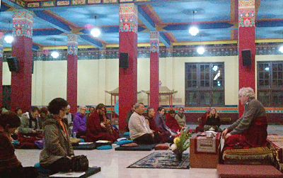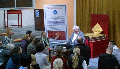 At the suggestion of His Holiness Karmapa, Khenpo Mriti, the administrator of the Karmapa International Buddhist Society had invited Lama Jampa to teach at The Karmapa International Buddhist Institute (KIBI) in Delhi. This was during the course of a one month Shamatha meditation programme for beginners. Lama Jampa and Dechen Dolma stayed at KIBI for seven days and one hundred people from various countries were present for the course during which Lama Jampa taught for five days on the Four Dharmas of Gampopa.