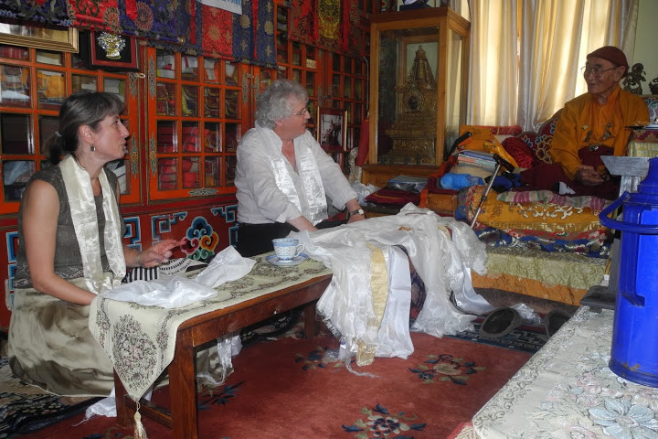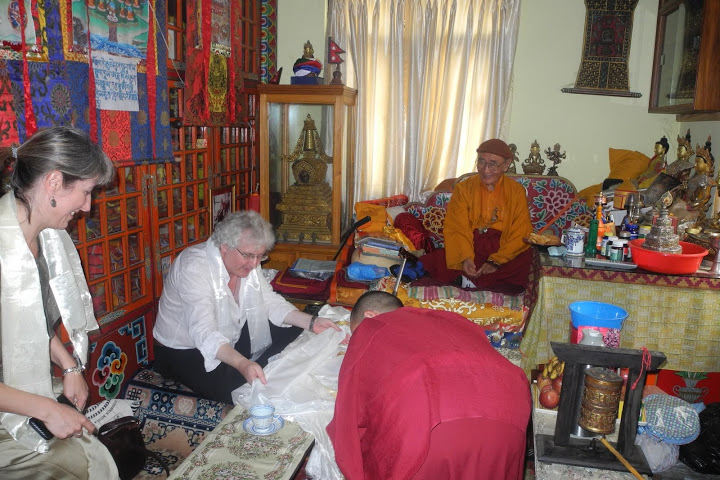 The fourth and last day of the visit was spent at the monastery with Rinpoche and at Jarong Kashor Stupa in Boudhanath. Before lunch the resident ordained sangha of Tegchen Legshey Ling gathered and made a doubled offering of the traditional long-life mandala and “Tenzhug” ritual to both Karma Thinley Rinpoche and Lama Jampa Thaye, wishing them long life and thanking them for their extensive Dharma activities.