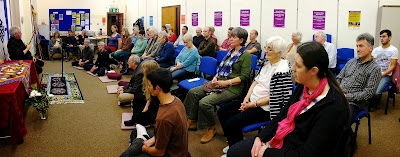Lama Jampa began by stressing that the existence of different traditions of Buddhism was a cause for rejoicing and that we should hold, “in our hearts a sense of the uniqueness and preciousness of the different types of Buddhism because they have all stemmed from the extraordinary genius of the Buddha’s mind.” He then continued with a precise summary of Atisha’s Seven Point Mind Training with great clarity and humour, presenting the essence of Bodhicitta, the central aspect of Mahayana Buddhism.